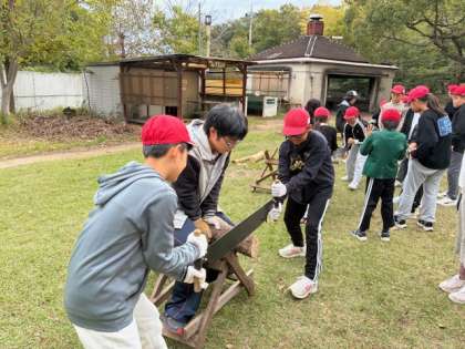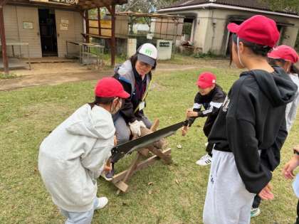 のこぎりを使って2人1組で薪を切る体験もしました!