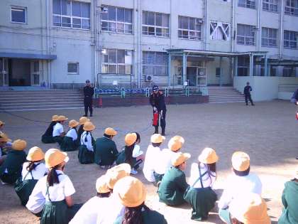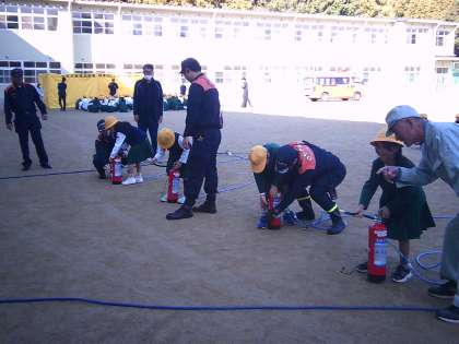 土曜授業 防災学習 中学年を対象とした初期消火訓練の様子です。
