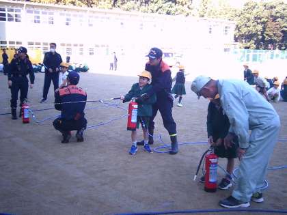 水消火器を使って、的(火)に水を当てる訓練をしました。