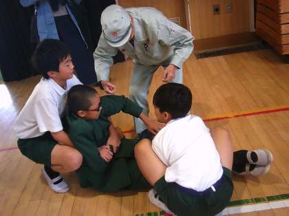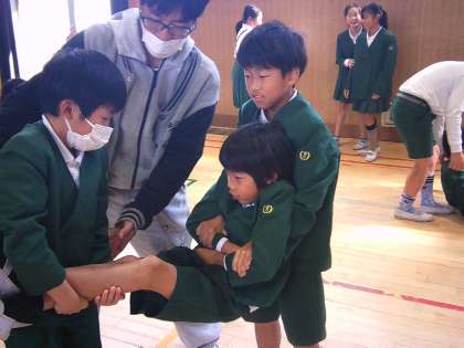 土曜授業 防災学習 高学年を対象とした搬送体験の様子です。