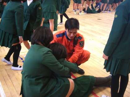 2人1組で救助者を搬送する体験を行いました。どのように身体を支えれば運びやすいのかを体感することができました。
