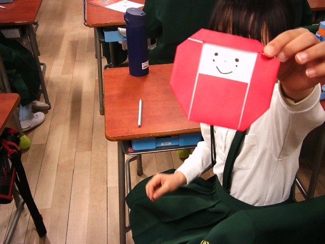1年1組では、折り紙を使って「だるま作り」をしていました。