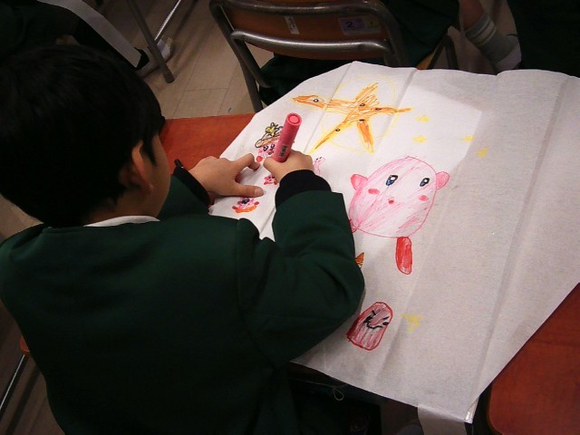 たこに、クレパスやマジックで楽しい絵をかき、たこ作りをすすめています。
