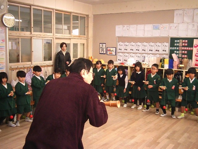 今日は、昔遊び名人の前田先生に来ていただいて、1年生に「昔遊び」を教えていただきました。