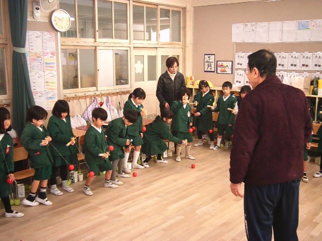 最近は、インターネットやテレビゲームなどの遊びが増え、けん玉やコマ、めんこなどの昔遊びに