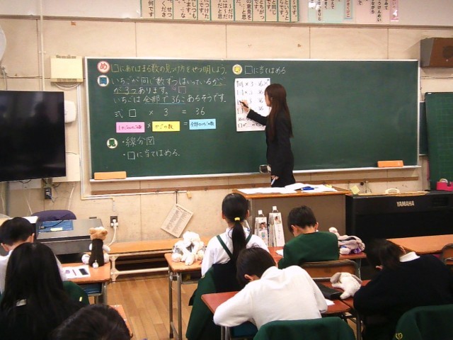 今日は3年生の研究授業として単元「□を使った式」の校内公開授業を行いました。