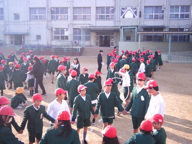 たてわり班で手をつないで輪になり、手を離さずにフラフープをくぐらせて次の人に送っていくゲームです。