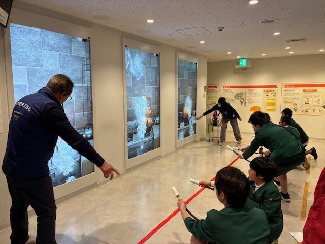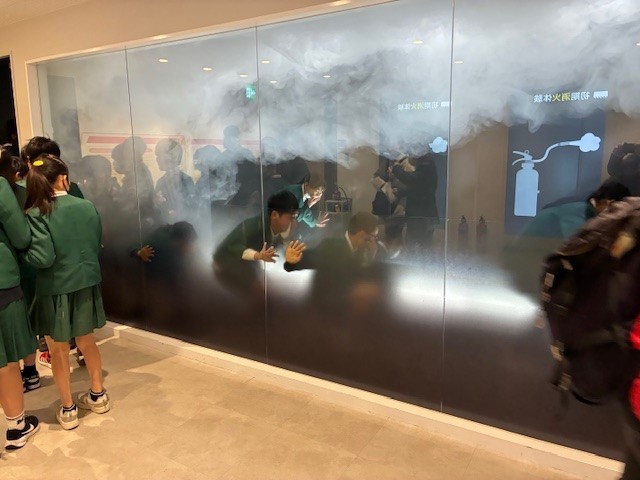館内はいくつかのスペースに分かれており、クラスごとに消火体験や煙中での避難の仕方、がれきの街体験など