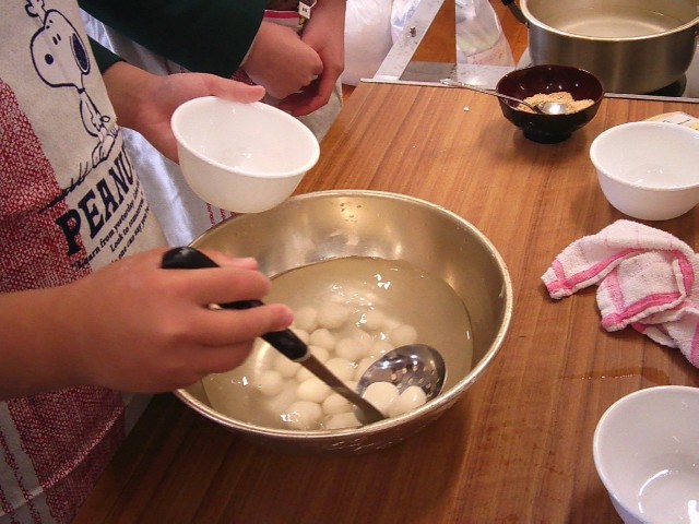 茹で上がった白玉団子にきなこをかけて「いただきます!」