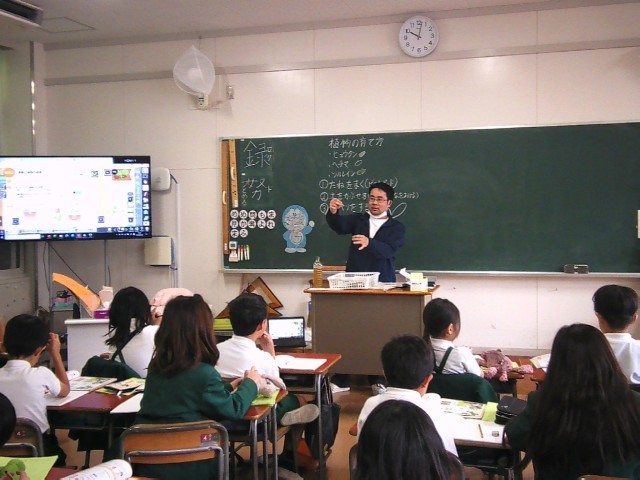 4年2組では、理科専科の先生の理科の学習でした。植物を植え、育てるための学習を行っていました。