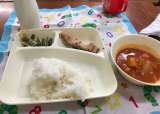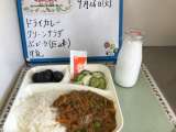 今日の献立:ドライカレー【米粉】、グリーンサラダ【ノンエッグドレシング】、ぶどう...