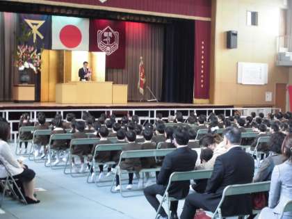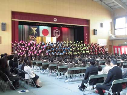 4月5日(金)春の暖かい日差しの下で、第32回入学式を行いました。満開の桜の花に見守られて、104名の元気な1年生が入学してきました。新しく2年生になった子どもたちも、お兄さんお姉さんぶりを発揮して、お迎えの言葉をしっかり言えました。