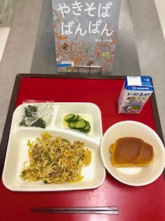 本日の献立は、「焼きそば・きゅうりのしょうがづけ・1/2黒糖パン・牛乳」でした。
