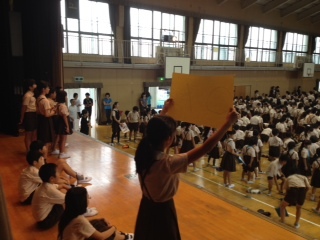 集会委員会が考えた今日のゲームは「ミッション ボールを回せ」です。集会委員会がやり方を見せる「ミッション」によって、いろいろな方法で各班ごとにボールを送っていきます。全員で気持ちを一つにして力を合わせないとできないので、みんな必死ですが自然と笑顔がこぼれます。一番速かったグループの名前が呼ばれますが、最後は全グループがほぼ同時でした。