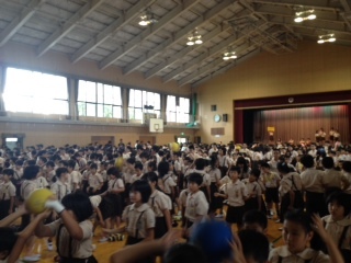 集会委員会はいつもみんなが仲よくなれるゲームをいろいろ考えて、それをわかりやすい方法で伝えてくれます。本校の高学年が低学年にやさしく、低学年が高学年を頼りにする秘密の一つはこの児童集会にありそうですね。