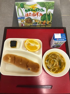 左の写真は、本日の献立と給食図書です。本日の給食図書は、「カボチャばたけのはたねずみ」でした。はたねずみの家族が畑のカボチャの実の中に住む絵本でした。