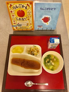 上段の写真は、本日の献立と給食図書です。本日の給食図書は、「りんごかもしれない」と「りんごがひとつ」でした。家の台所にあったりんごから、様々な空想をする絵本と、お腹をすかしている動物たちがいる中、たったひとつのりんごを一匹のサルが独り占めしようとする絵本でした。