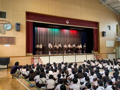 5月9日(木)全校児童が講堂に集まって、朝の児童集会で児童会代表のあいさつがありました。