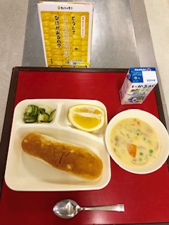 本日の献立は、「コーンクリームシチュー・キャベツときゅうりのサラダ・かわちばんかん・おさつパン・牛乳」でした。