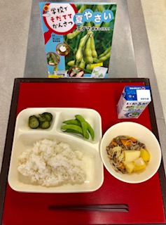 上段の写真は、本日の給食と給食図書です。本日の給食図書は、「学校でそだててかんさつ 夏やさい エダマメをつくろう!」でした。学校でエダマメを育てる時の、植え方や、観察をするポイントがわかる図書でした。