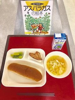 上段の写真は、本日の給食と給食図書です。本日の給食図書は、「アスパラガスの絵本」でした。アスパラガスの種類や栄養、育て方等が載っている絵本でした。