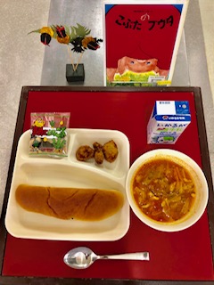 上段の写真は、本日の給食と給食図書です。本日の給食図書は、「こぶたのブウタ」でした。くいしんぼうで知りたがりやの子豚のブウタが、豚を食べることが好きなおおかみの家に連れていかれる物語でした。