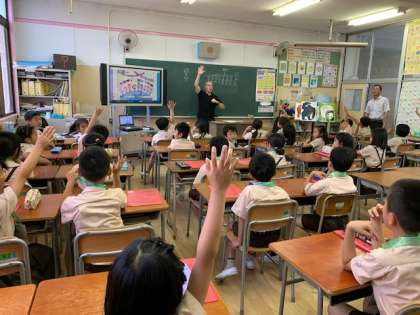 Let's tryとWe canという教材を使って主に担任が授業しましたが、3年生ではC-NETのアダム先生が授業をしました。3年生の子どもたちは英語で名前を尋ね合いながら、サイン集めをするゲームを楽しみました。