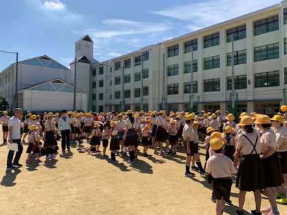 6月3日(月)6月第1週が始まりました。全校朝会の後で、6年生が1年生に手作りのメダルを手渡しました。これから1年間、縦割りの「なかよし班」で集まるときに首からかけます。表にかわいい絵が描いてあって、裏には一人一人の名前が書いてあるので、1年生は大喜びです。13日の「なかよし集会」が楽しみですね。