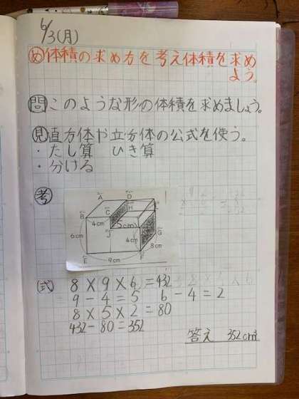 2時間目には5年生で、算数の公開授業をしました。「直方体や立方体のかさの表し方を考えよう」という単元で、複合図形の体積の求め方を自分で考えたり、班で話し合ってまとめていきました。5年生の子どもたちは、既習事項をもとに多様な方法を考えることができました。