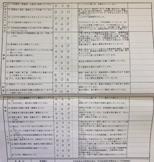 写真は、「給食自主管理票」という給食調理の衛生管理の現状を正しく把握し、その充実向上を図るものです。項目の中には「加熱は十分行ったことを確認しているか。」や「食物アレルギー個別対応はマニュアルどおり実施しているか。」等があります。