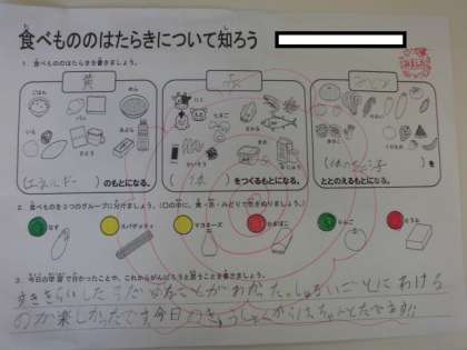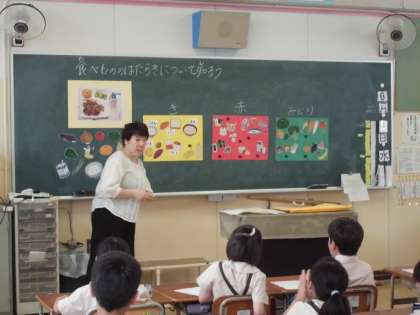 6月5日(水)は、1,2年生で栄養指導がありました。栄養教諭の授業を受けました。今回は、「食べもののはたらきについて知ろう」というテーマで、食べものには、エネルギーのもとになる黄色グループ、体をつくるもとになる赤色グループ、体の調子をととのえるもとになる緑色グループがあることを学びました。児童の感想には、「すききらいしたらだめなことがわかった。今日の給食からはちゃんと食べます。」とありました。