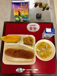 上段の写真は、本日の給食と給食図書です。本日の給食図書は「メロンに付いていた手紙」でした。メロンに付いていた手紙から始まった、東京と夕張に暮らす2人の小学生の物語でした。