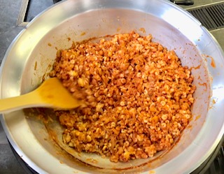 えびのチリソースは、たまねぎをしょうが、にんにく、トウバンジャンで香りよく炒め、砂糖、トマトケチャップ、しょうゆで味付けして作ったチリソースに、揚げたえびを絡ませた、揚げもの料理でした。
