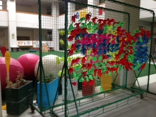学校では2年生が使う大玉に空気を入れたり、1年生が団体演技で使うカラー軍手を洗濯したりして運動会に向けての準備が進んでいます。