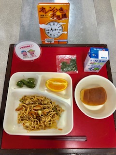 本日の献立は、「焼きそば・オクラのかつお梅風味・オレンジ・黒糖パン(小)・牛乳」でした。