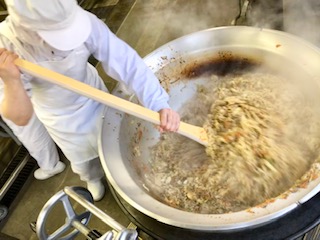 下段の写真は、焼きそばを作っているところです。写真の釜だけで約300食あります。