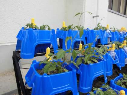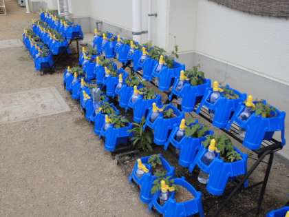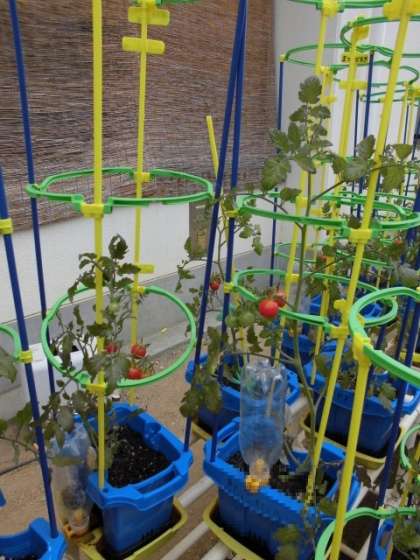 1年生はあさがおを、2年生はミニトマトを育てています。あさがおはつるが伸びてきました。そろそろ支柱を立てる時期が近づいています。ミニトマトはたくさん実がついています。赤く色づいて、もう食べ頃なものもあります。週末の雨でまた一段と成長することでしょう。