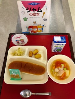 上段の写真は、本日の給食と給食図書です。本日の給食図書は「ジャムの絵本」でした。りんごやいちご、かんきつ類等のジャムの作り方が載っている絵本でした。