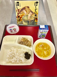 上段の写真は、本日の給食と給食図書です。本日の給食図書は「ほしじいたけ ほしばあたけ」でした。きのこ村に住む、ほしじいたけをはじめとした、いろいろなきのこが登場する絵本でした。