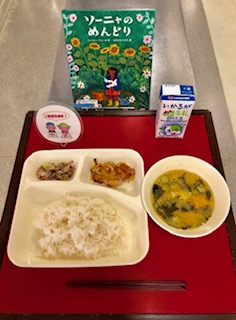 上段の写真は、本日の給食と給食図書です。本日の給食図書は「ソーニャのめんどり」でした。ソーニャという女の子が三羽のひよこを育てる、命の尊さが学べる図書でした。