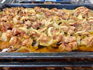鶏肉の甘辛焼きは料理酒、砂糖、みりん、しょうゆで下味をつけた鶏肉とたまねぎを焼き物機で蒸し焼きにした焼きもの料理でした。