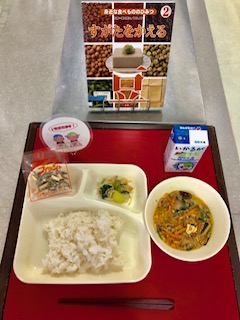 上段の写真は、本日の給食と給食図書です。本日の給食図書は「すがたをかえる豆」でした。とうふや、みそ、あんこ等、色々な豆の加工品が載っている図書でした。