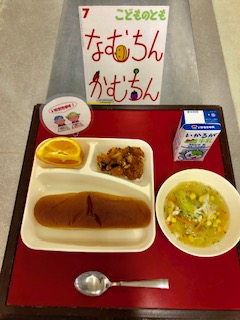 上段の写真は、本日の給食と給食図書です。本日の給食図書は「なむちんかむちん」でした。小さななすびの子、かぼちゃの子、そらまめの子、とうがらしの子が、かぼちゃのばあちゃんのおまじないで大きくなる絵本でした。