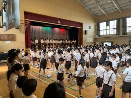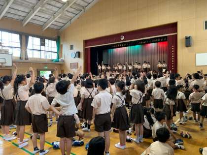 朝は児童集会で「アンパンマンの命令」をしました。集会委員が見本を見せた後、1〜6年のなかよし班で楽しくゲームをしました。