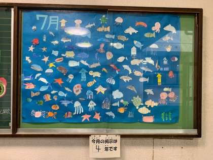 玄関ホールには、4年生が作成した「海の生き物」の絵が掲示してあります。夏休みまで学校へ来る日は、今日を含めてあと11日。終業式まで、毎日元気に登校してほしいですね。