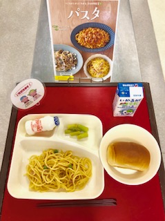 上段の写真は、本日の給食と給食図書です。本日の給食図書は「つくりかたがよくわかる/お料理教室5 パスタ」でした。パスタの種類やいろいろなパスタ料理の作り方が載っている料理の図書でした。