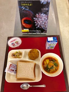 上段の写真は、本日の給食と給食図書です。本日の給食図書は、「うまれたよ!タコ」でした。タコのお母さんがタコツボの中で、たくさんの卵の世話をしている様子が載っている図書でした。