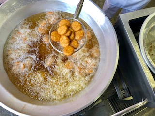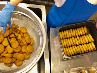下段の写真は、チキンレバーカツを配缶しているところです。