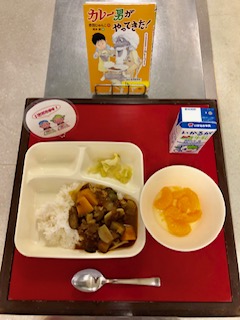 上段の写真は、本日の給食と給食図書です。本日の給食図書は「カレー男がやってきた!」でした。突然、家を訪れカレーをぺろりとたいらげるカレー男と、小学校1年生の男の子のお話しです。