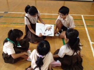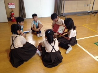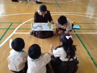 ふだんから児童集会の「なかよし班」で一緒に行動している1年生に、6年生が本の読み聞かせをするという時間でした。